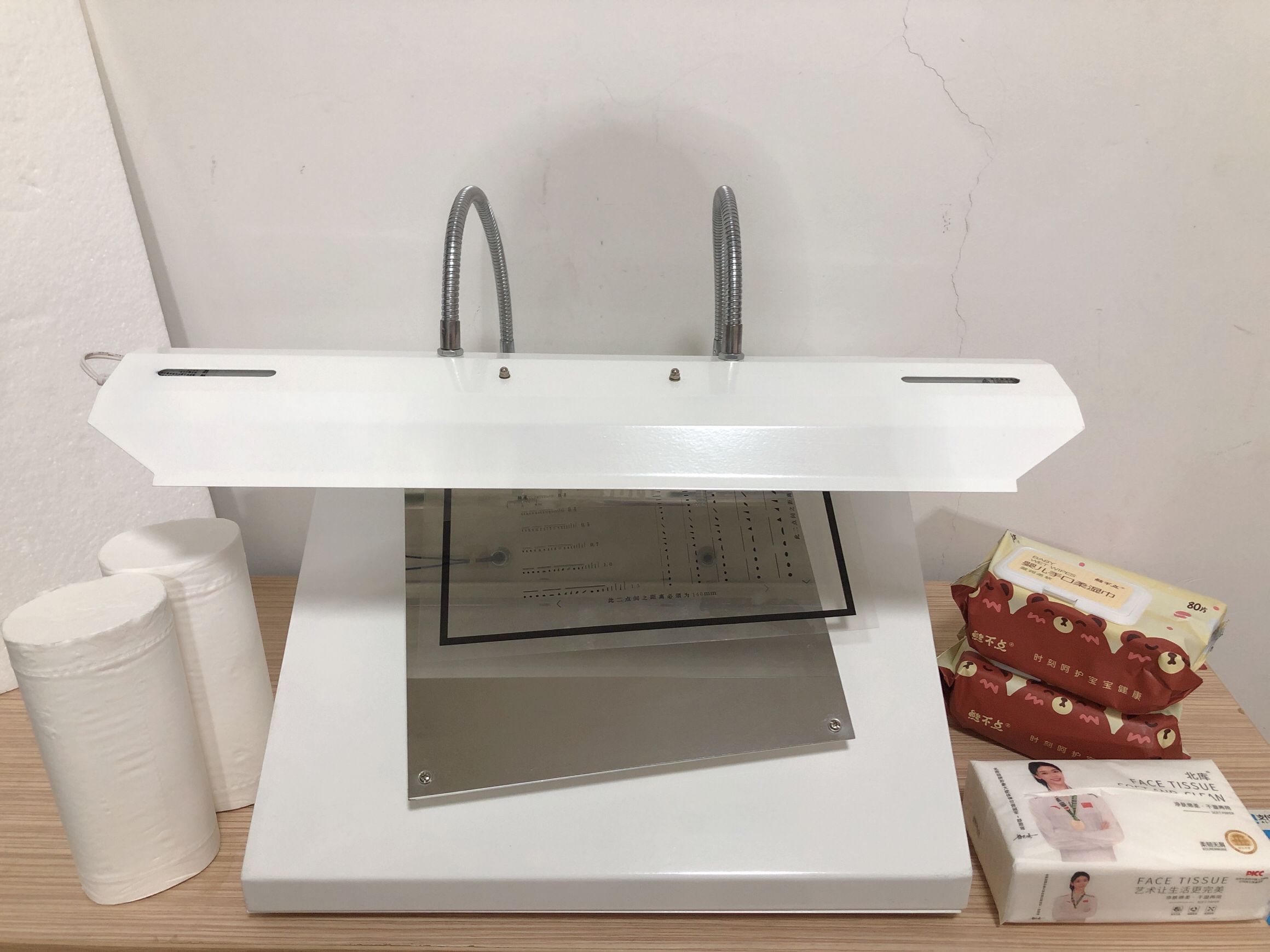 紙張塵埃度儀技術參數: 1、光源: 20W日光燈 2、照射角度: 60° 3、旋轉工作臺: 270mm×270mm,有效面積為0.0625 m2,可旋轉360° 4、標準塵埃圖片: 0.05~5.0(mm2 ) 5、外形尺寸: 428×350×250(mm ) 6、質量: 8 Kg 紙張塵埃度儀操作方法: 1、取樣:切取4張以上250mm×250mm試樣 2、觀察:將其中一張試樣放在可旋轉工作臺上。打開日光燈,并在日光燈下檢查試樣面上肉眼可見塵埃。觀察時眼睛的視距保持為250~300mm,用不同的標記圈出不同面積的塵埃;也可采用按不同面積的大小,分別記錄同一面積的塵埃個數。 3、比對:將工作臺旋轉90°,每旋轉一次后,用標準塵埃度圖片鑒定試樣上塵埃度面積的大小,也可采用按不同面積后把新發現的塵埃度加以標記,直到返回到最初的位置。 衛生紙塵埃度測定儀國家標準:GB/T1541