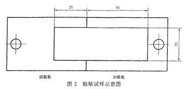2.5 在溫度23℃±2℃,相對濕度65%±5%的條件下,按圖2規(guī)定的尺寸,將試樣平行于板的縱向粘貼在緊挨著的試驗(yàn)板和加載板的中部。用壓輥以約300 mm/min的速度在試樣上滾壓。注意滾壓時(shí),只能用產(chǎn)生于壓輥質(zhì)量的力,施加于試樣上。滾壓的次數(shù)可根據(jù)具體產(chǎn)品情況加以規(guī)定,如無規(guī)定,則往復(fù)滾壓三次。