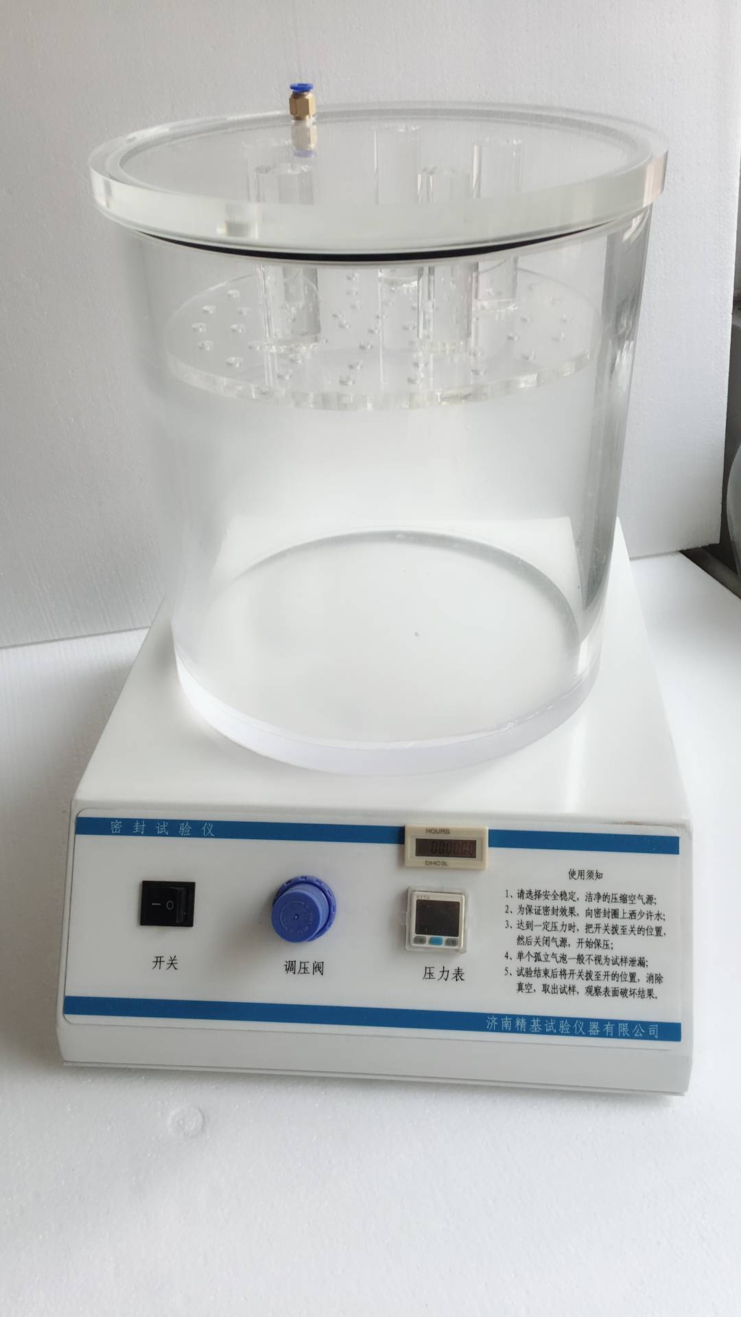 通過對真空室抽真空,使浸在水中的試樣產生內外壓差,觀測試樣內氣體外逸情況,以此判定試樣的密封性能;通過對真空室抽真空,使試樣產生內外壓差,觀測試樣膨脹及釋放真空后試樣形狀恢復情況,以此判定試樣的密封性能。