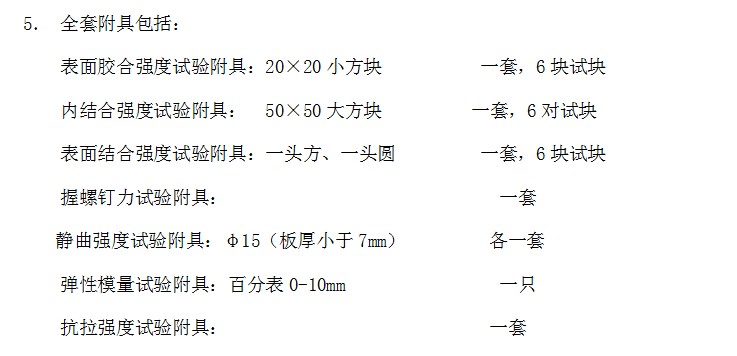 1膠合強度拉伸試驗附具 2靜曲強度試驗附具 3表面結合拉伸試驗附具 4內結合拉伸試驗附具 5彈性模量試驗附具 6握螺釘力試驗附具