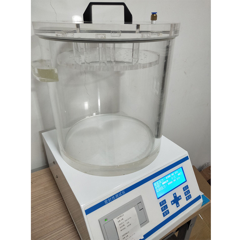 通過對真空室抽真空,使浸在水中的試樣產生內外壓差,觀測試樣內氣體外逸情況,以此判定試樣的密封性能;通過對真空室抽真空,使試樣產生內外壓差,觀測試樣膨脹及釋放真空后試樣形狀恢復情況,以此判定試樣的密封性能。