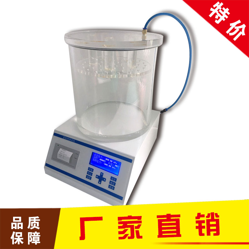 通過對真空室抽真空,使浸在水中的試樣產生內外壓差,觀測試樣內氣體外逸情況,以此判定試樣的密封性能;通過對真空室抽真空,使試樣產生內外壓差,觀測試樣膨脹及釋放真空后試樣形狀恢復情況,以此判定試樣的密封性能。